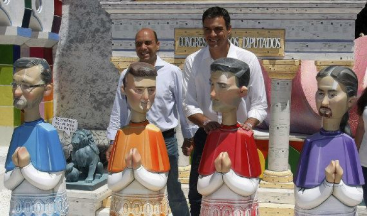 El secretario general del PSOE, Pedro Sánchez, posa junto a su 'ninot' y los que representan a Mariano Rajoy, Albert Rivera y Pablo Iglesias en la hoguera ganadora este año 'Neo-mística', durante la visita que ha realizado a los principales monumentos levantados en las fiestas de las Hogueras de Alicante.