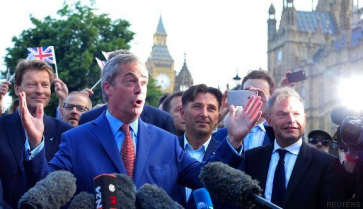 El primero en reaccionar a la victoria del 'sí' ha sido el eurófobo Nigel Farage, que paradójicamente al cierre de las urnas confesaba a un periodista de Sky News que parecía que la permanencia había ganado. Bien distintas han sido sus declaraciones y gestos de esta madrugada, cuando no ha ocultado su euforia al ver que su objetivo se iba a cumplir.