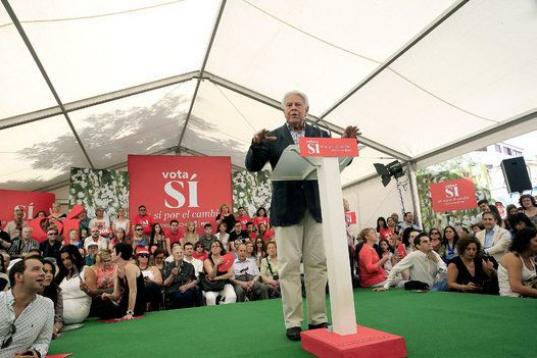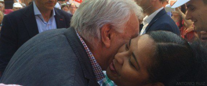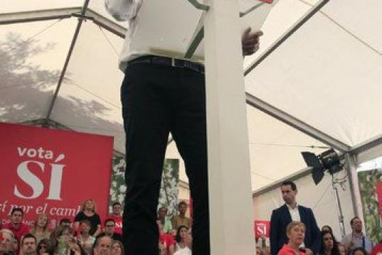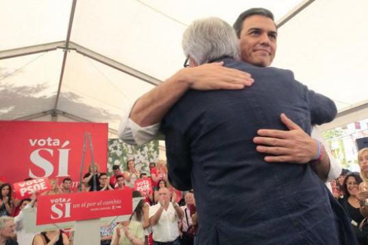 “Esta es mi intervención en campaña, deseo lo mejor, quiero que gane Pedro Sánchez”. Sus palabras vuelven a recibir aplausos. Sánchez lo mira atentamente en la primera fila. Se levanta, es su turno. Se abrazan, miran a las cámaras. El calor se acrecenta y los abanicos con el logo del PSOE disparan también sus movimientos.