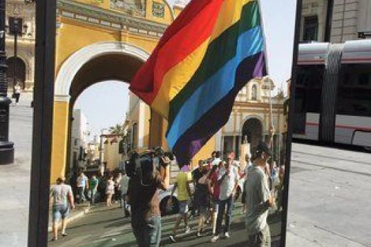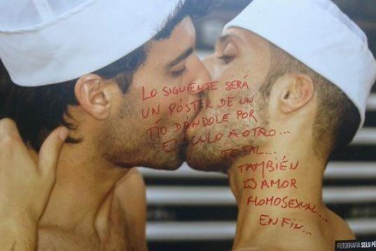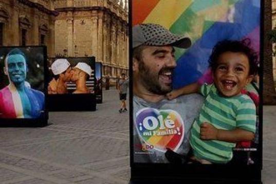 ¿Que en España somos muy tolerantes con la diversidad sexual? Pues historias como esta lo ponen el tela de juicio. Estamos en Sevilla, donde el ayuntamiento (PSOE) ha inaugurado la exposición al aire libre Orgullo de Sevilla, una serie de fotografías de enorme formato colocadas en una especie de marquesinas en pleno centro peatonal, que han amanecido este viernes con pintadas, un acto vandálico que no deja lugar a dudas de la intención de quien lo ha llevado a cabo: sobre la imagen en la que aparecen dos hombres con vestidos de marineros y besándose, se ha pintado en rojo el mensaje "Lo siguiente será un póster de un tío dándole por el culo a otro... total... también es amor homosexual.... en fin".