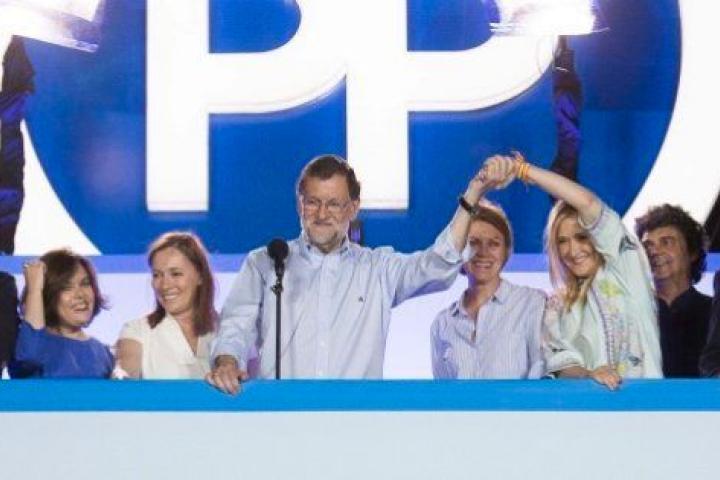 Delirio absoluto cuando sale Rajoy. Los altavoces escupen la versión merengue del PP. Se mueven las caderas. El presidente muy contento, tanto que se le olvida decir que ha ganado las elecciones. Alguien se lo recordará durante su discurso para que lo deje claro. Y es que el líder conservador sale reforzado de esta cita y ya ha reclamado el Gobierno. Con Ciudadanos suma 169 escaños, a siete de la mayoría absoluta. Le tocará al PSOE mover ficha finalmente.