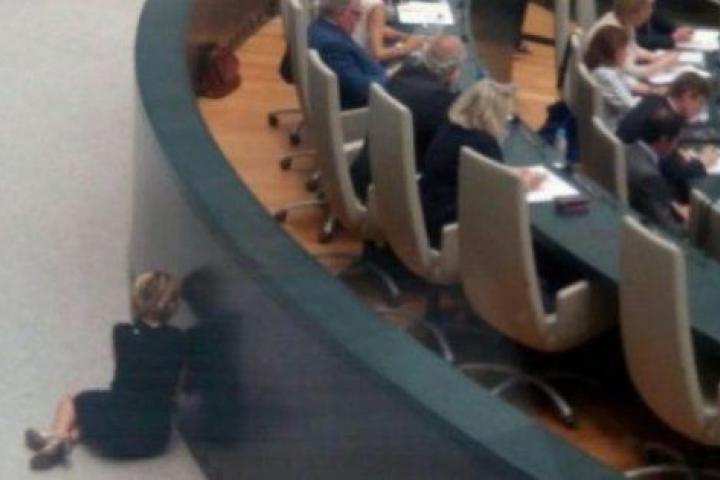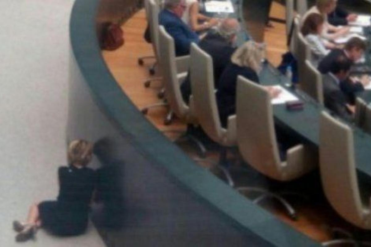 Una de las imágenes del día la ha protagonizado la portavoz del PP en el Ayuntamiento de Madrid, Esperanza Aguirre. A primera hora de este martes, Ahora Madrid de Ciudad Lineal subió una foto a Twitter en la que se veía a la dirigente 'popular' hablando por teléfono sentada en el suelo, recostada sobre el muro que separa los escaños de su partido de la parte externa del Pleno.