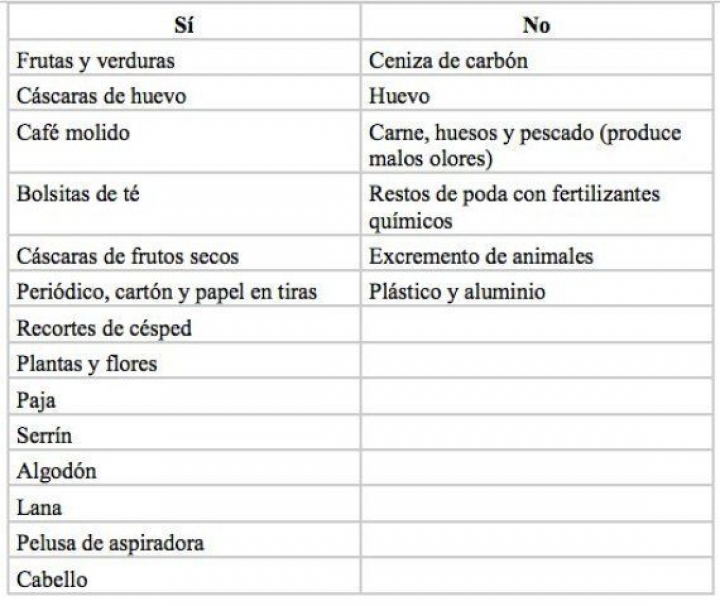 - Llenado. Se coloca en el fondo del compostero una capa de serrín. Este impide la liberación de malos olores, la procreación de insectos y absorbe el exceso de humedad. También se pueden poner algunos puñados de estiércol para que sirvan de fermentos.A continuación se coloca una segunda capa con los desechos alimenticios, orgánicos, de los mencionados en la tabla inferior. Si éstos están muy secos, es recomendable agregar un poco de agua para mantener la humedad. Las siguientes capas se intercalan siempre con una de serrín. Antes de depositar la siguiente capa de desechos alimenticios, es recomendable revolver y humedecer las anteriores y siempre se rematará con una capa de serrín seco.También es recomendable intentar alternar capas de materiales secos con materiales húmedos. La hierba cortada, los restos de cosechas, las hojas secas y la paja también son muy útiles. Añadir alguna capa de compost viejo o de estiércol que actuará como levadura. Cuando se haya mezclado más de la mitad del recipiente habrá que remover bien y mezclar todos los materiales en descomposición. Se debe regar de vez en cuando, sobre todo si se nota que el compuesto está muy seco. Seguir llenando el compostador alternando capas, y continuar mezclando y aireando cuando lo necesite.