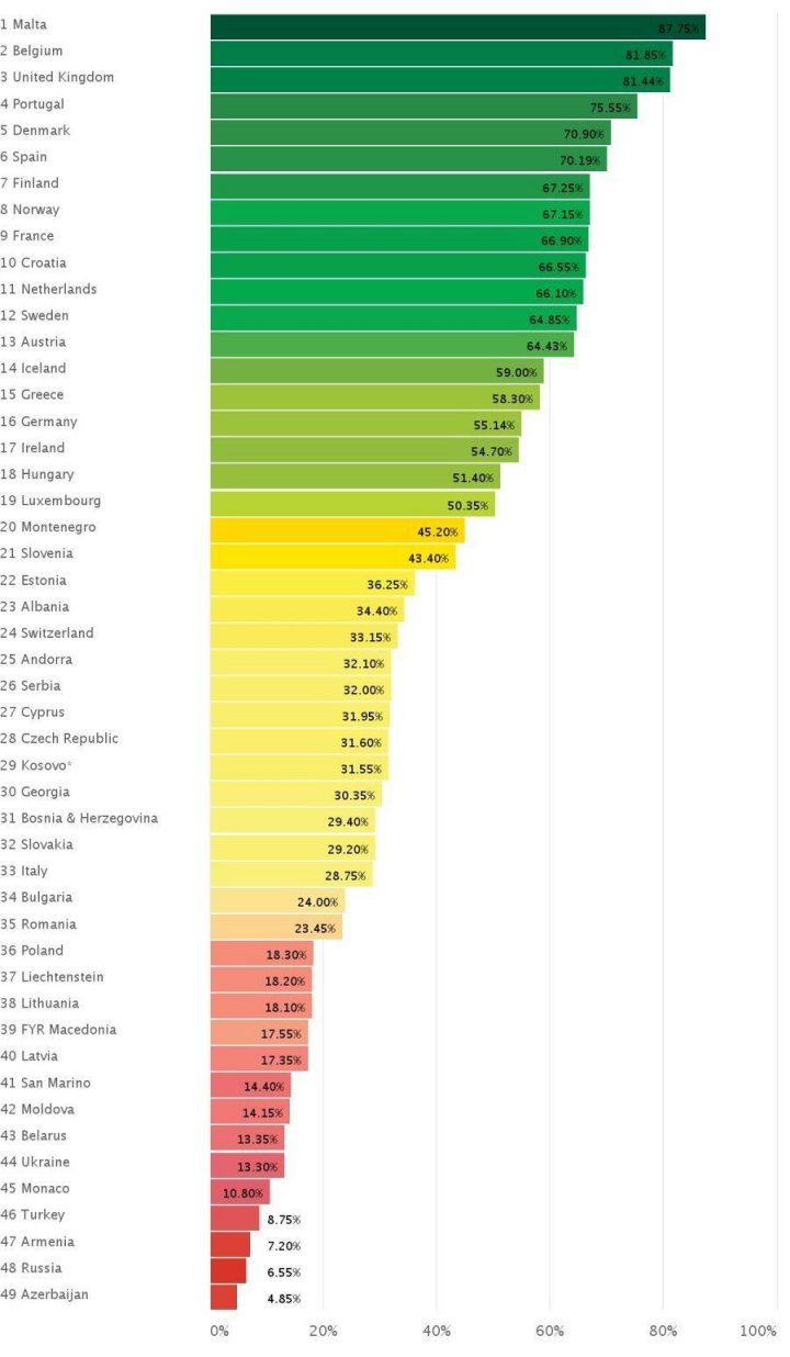 En la lista se recogen un total de 49 países y España se sitúa en un respetable sexto puesto, con una puntuación del 70,19%. Sólo cinco países se sitúan por delante: Malta (87,75%), Bélgica (81,85%), Reino Unido (81,44%), Portugal (75,55%) y Dinamarca (70,90%). En el lado opuesto se encuentran Mónaco (10,8%), Turquía (8,75%), Armenia (7,2%), Rusia (6,55%) y Azerbaiyán (4,85%).