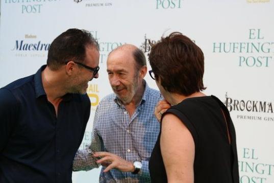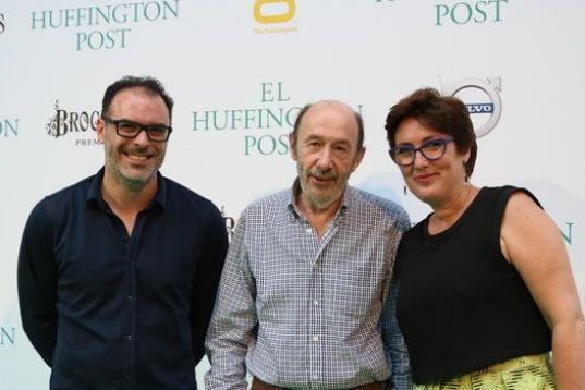 Alfredo Pérez Rubalcaba, entre Guillermo Rodríguez y Montserrat Domínguez, subdirector y directora de 'El Huffington Post'