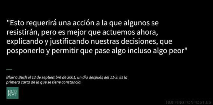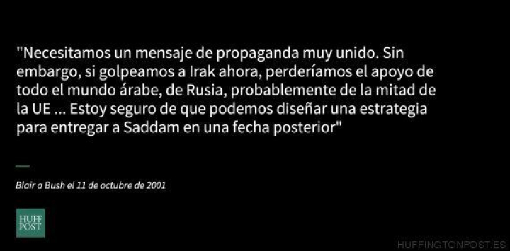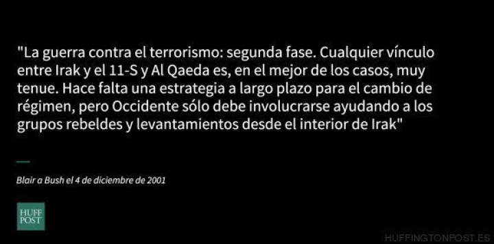 De estas notas y cartas lo que se extrae es que Blair, que gobernó entre 1997 y 2007, admite que no está seguro de poder conseguir respaldo en Reino Unido para el plan de Bush de atacar a Hussein por cualquier medio, ni siquiera en su propio Gobierno. "Si ganamos rápido, todo el mundo será nuestro amigo. Si no ganamos y no se han implicado antes, empezarán las recriminaciones".