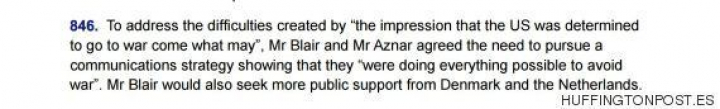 El ex primer ministro pone de manifiesto también su preocupación sobre cómo justificar ante el resto del mundo la guerra, de ahí que aluda a una "campaña pública" unida. Es ahí donde entra en juego José María Aznar, que aparece mencionado en el informe un total de 17 veces, con quien se pacta esa foto de "unidad", escenificada en Las Azores. Así, en el informe se recoge cómo Blair, consciente de que EEUU quería ir a la guerra sí o sí, acuerda con Aznar perseguir una estrategia de comunicación que mostrara que ellos habían hecho todo lo posible por evitarla.