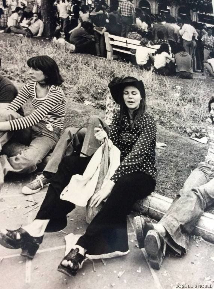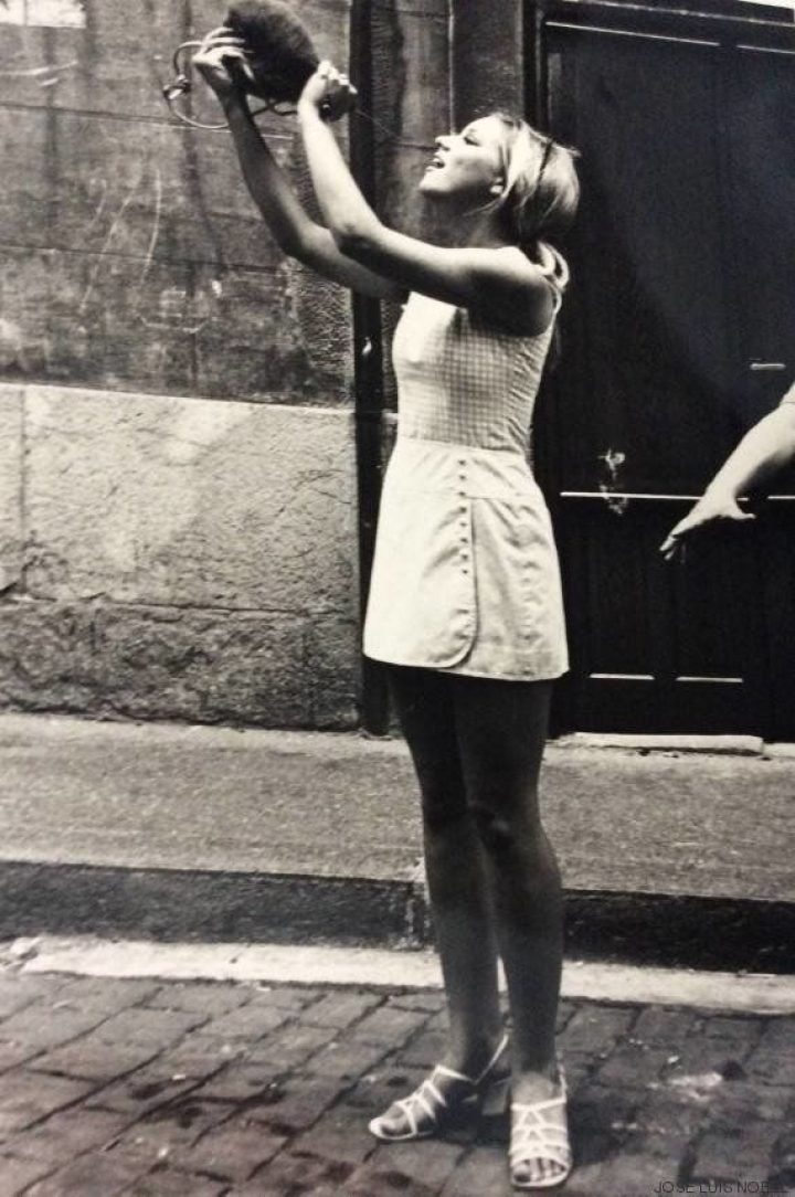 Es fantástica ¿no? Desde la camisa de lunares hasta los pantalones campana, más los topolinos de corcho de su acompañante a la izquierda de la foto y las playeras de la chica melena casi bob con camiseta de rayas. ¿Donde estarán ahora, habrán vuelto a San Fermín alguna otra vez? Seguro que serían partidarias de la ocurrencia del ayuntamiento de este año, que ha decidido repartir por las calles un líquido que salpicará a quien orine en la calle.