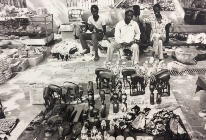 Estos africanos no tienen ningún miedo de posar ante la cámara del fotógrafo navarro. Incluso le dedican alguna de sus sonrisas. Tampoco parece que vigilen preocupados por la llegada de los guardias que les vayan a obligar a echar a correr con sus pertenencias a cuestas. No podrían ir muy lejos con tal cantidad de máscaras, elefantes, gacelas (o como se llamen) y demás cachivaches que los rodean. Ni necesitaban móvil ni pinganillo para comunicarse el acecho policial. Aún éramos un país amable con la emigración.