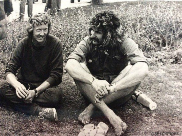 Que sepamos, ni son primos de Rod Stewart ni de Simon and Garfunkel, pero no podemos daros el lugar de la peluquería donde el de la derecha se hacía las mechas ni el de la izquierda compraba unas gafas. ¿Quizá las Ray Ban de aviador? No, demasiado vulgar. O quizá no, corría 1984 según el archivo de Nobel, cuando hizo esta foto que hoy puede tomarse en cualquier festival de la península.