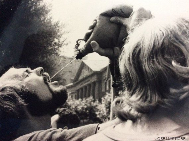 Aprender a beber de la bota después de que te hayan rocíado la camiseta con tinto de arriba abajo, es más fácil que correr en el encierro. Más si la bota encurtida te la sujeta una rubia de esas que invadieron primero las costas de Marbella en los 50 y aún hoy en estas fechas abundan por las calles de Pamplona. Jose Luis Nobel Goñi capturó el momento a mitad de los 80.