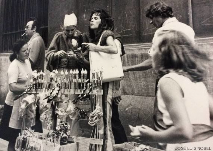 Hace 35 años, los puestos de baratijas ya sustituían a los de los ajos. Por lo demás, la vendedora y las presuntas compradoras nos resultan tan familiares como las del mercadillo del sábado en tu ciudad. Sólo el cigarro del hombre de la foto, chirría. Hoy quizá lo luciría una de las protagonistas de Nobel.