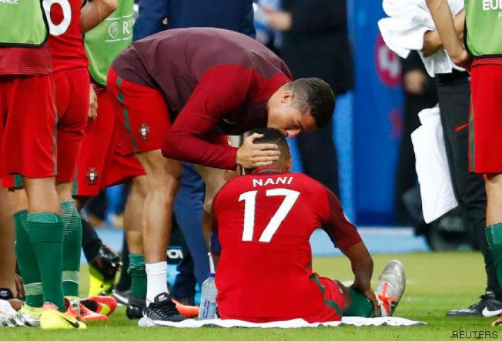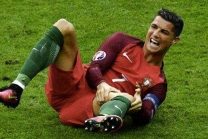 Pese a que el árbitro no pitó ni falta, el delantero portugués se quedó tirado en el suelo y tuvo que ser atendido por los fisioterapeutas. Pese a los pitos de la afición francesa, 15 minutos más tarde tuvo que volver a salir del campo, con un medio llanto que captó la atención de todos los fotógrafos.