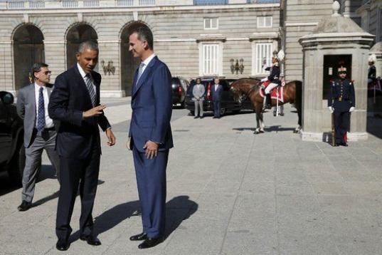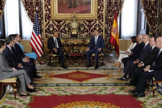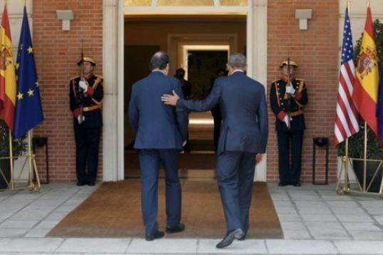 Rajoy ha regalado el jamón, con el correspondiente jamonero y un cuchillo durante el encuentro que ambos han mantenido en la sede de la Presidencia del Gobierno, en el marco de la visita oficial que Obama realiza a España.