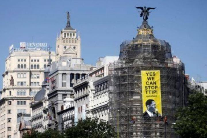 Los más visuales han sido los activistas de Greenpeace. Miembros de la ONG han aprovechado para evidenciar en Madrid su protesta contra el Acuerdo Transatlántico de Comercio e Inversión, mas conocido como TTIP. Seis escaladores de Greenpeace han colgado una pancarta de 60 metros cuadrados en el conocido edificio Metrópolis del centro de la capital con el mensaje "Sí podemos parar el TTIP", dirigido al presidente Obama y en referencia a su famoso eslogan durante la campaña de 2008: "Yes we can" (Sí podemos).