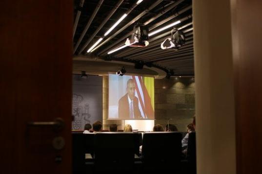 El resto de los periodistas acreditados se han tenido que conformar con ver la reunión en una pantalla en la sala de prensa del Palacio de la Moncloa.