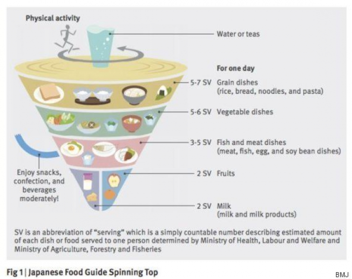 En 2005 Japón publicó unas recomendaciones que representan a la perfección su historia culinaria. En vez de presentarlas en forma de pirámide como es habitual, lo hicieron en forma de peonza. Kayo Kuratani, investigador del Centro Nacional para Salud Global y Medicina y uno de los autores del estudio, destaca lo fácil que es comprender y seguir el gráfico. Además, el dibujo muestra platos completos, no ingredientes sueltos como suelen hacer las clásicas pirámides.