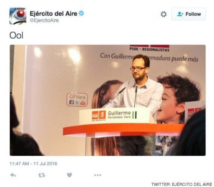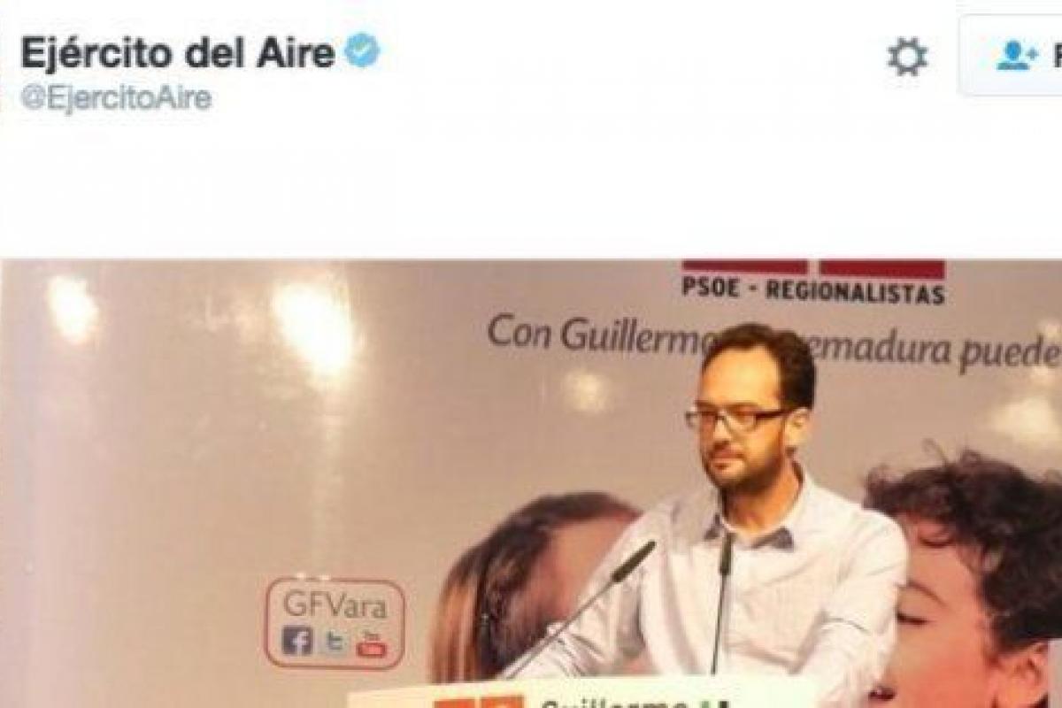 La cuenta en Twitter del Ejército del Aire ha sorprendido este lunes con un extraño tuit con el mensaje "Ool" y una fotografía del portavoz parlamentario del PSOE, Antonio Hernando, en un acto en Extremadura.