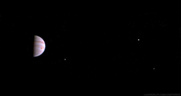 La NASA ha lanzado este 13 de julio la primera imagen que la sonda espacial Juno, que orbita alrededor de Júpiter desde la noche del 4 de julio, ha tomado del mayor planeta del Sistema Solar. La fotografía en color muestra a Júpiter y su famosa Gran Mancha Roja y también a tres de sus cuatro lunas más grandes: Io, Europa y Ganímedes. En la foto sólo faltaría Calisto.