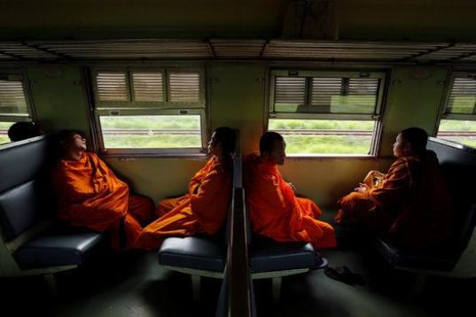 Un grupo de monjes turistas viajan en tren dirección al templo de Ayutthaya a las afueras de Bangkok, Tailandia.
