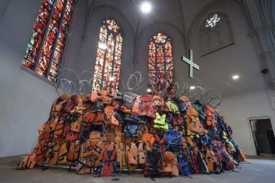 'Una pared de chalecos salvavidas y sus historias' se llama la escultura expuesta en la iglesia de San Juan en Saarbrücken, Alemania. La obra de Andrew Wakeford y Fred George se compone de un conjunto de chalecos salvavidas recogidos de las pla...