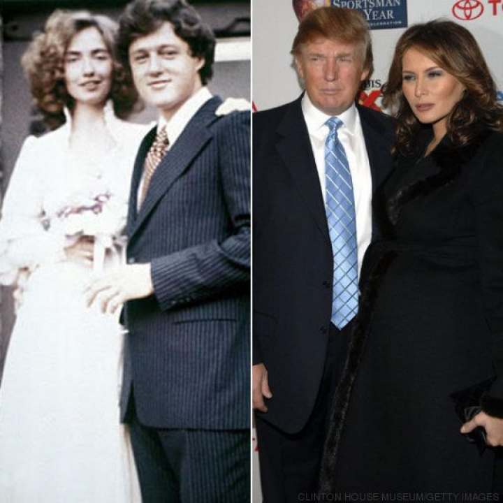 Izquierda: Hillary y Bill Clinton en su boda, el 11 de octubre de 1975. Derecha: Donald y Melania Trump en un evento en Nueva York en 2005, el mismo año de su boda.