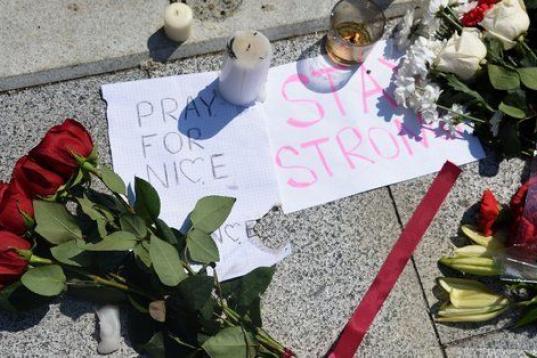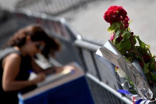 Flores y mensajes de apoyo (reza por Niza, manteneos fuertes) a las afueras de la Embajada francesa en Moscú (Rusia).