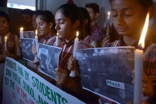 Estudiantes indias del colegio público DAV encienden velas durante un acto conmemorativo por las víctimas en Amristar, India.