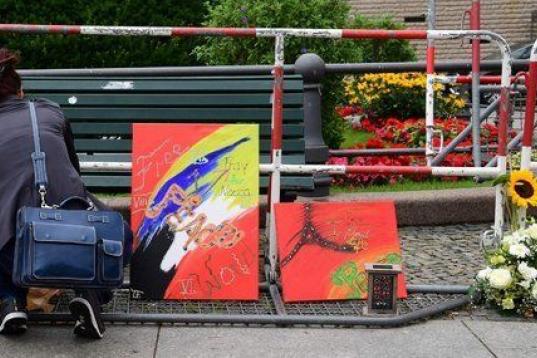 Frente a la embajada de Francia en Berlín (Alemania), una mujer deposita un ramo junto a dos cuadros que piden oraciones por Niza.