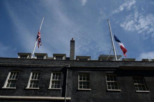 Las banderas de Reino Unido y Francia ondean a media asta sobre el número 10 de Downing Street, residencia oficial del primer ministro británico.