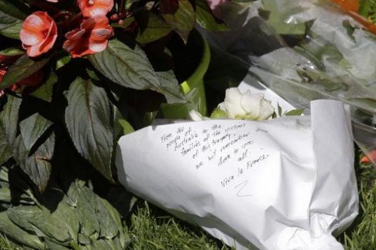 Un ramo de flores con un mensaje, depositado cerca del lugar de la matanza. Dice así: "De la gente de Australia a las familias de las víctimas de esta tragedia. Los recordaremos. Os queremos a todos. Viva Francia".