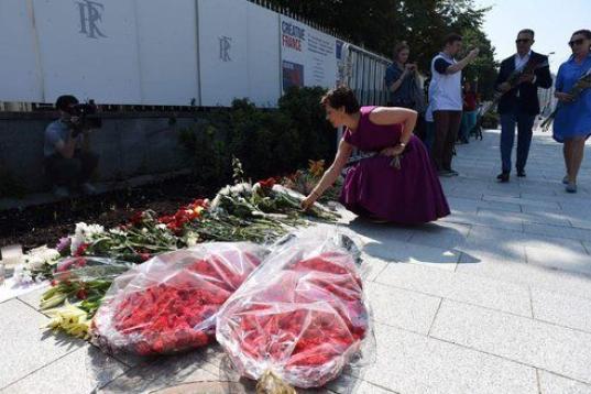 Inmensos ramos de flores depositados a la entrada de la Embajada de Francia en Moscú (Rusia).