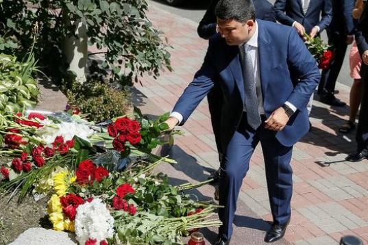 El primer ministro ucraniano, Volodymyr Groysman, deja un ramo de flores junto a las decenas de ofrendas de sus conciudadanos frente a la embajada francesa en la capital, Kiev.