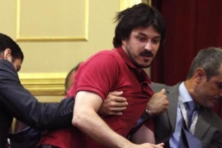 Un miembro de la plataforma de víctimas del accidente del Alvia ha lanzado desde la tribuna de invitados del Congreso un papel de protesta contra la elección de Ana Pastor como presidenta del Congreso.