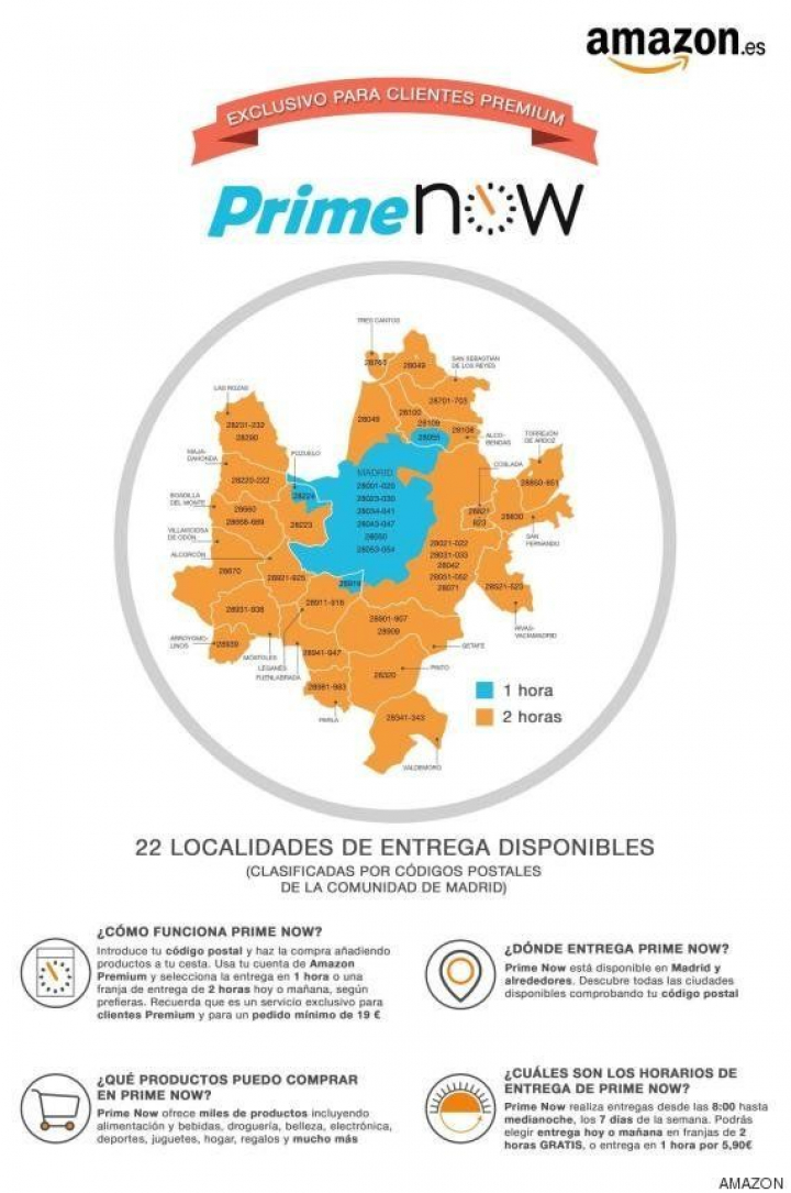 Madrid será la tercera ciudad de Europa Continental (la cuarta después de Londres) en incorporar este servicio exprés para sus usuarios Premium, llamado Prime Now. Según explican fuentes de la compañía, los pedidos se recibirán en una hora tanto en la capital como en 21 poblaciones a su alrededor: