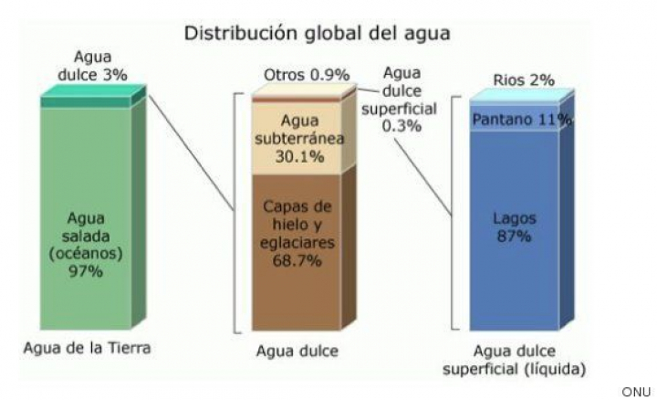Geográficamente, en todo el planeta, el volumen total de agua existente es del orden de los 1.400 millones de km³, de los cuales una inmensa mayoría son de agua salada (el el 97,5%, 1.365 millones de km³). De agua dulce sólo existe el resto, el 2,5%: 35 millones de km³. Dentro de ese porcentaje de agua dulce, el 68,9% (unos 24 millones de km³) se encuentra en forma de hielo y nieves perpetuas en las regiones antárticas y árticas, mientras que el 30,8% (unos 10,8 millones de km³) se encuentra almacenada en el subsuelo. Solamente el 0,3% del agua dulce (unos 105.000 km³) se encuentra en ríos y lagos. Por tanto, el agua dulce utilizable por el hombre es sólo una parte del agua de los ríos y lagos así como de los acuíferos, pudiendo alcanzar los 200.000 km³ lo que equivale a algo menos del 0,6% del agua dulce disponible, o al 0,014% del agua existente en la tierra. Así, si todo el agua del mundo fuera un bidón de cinco litros, la cosa quedaría así: