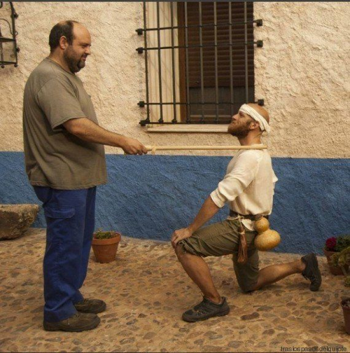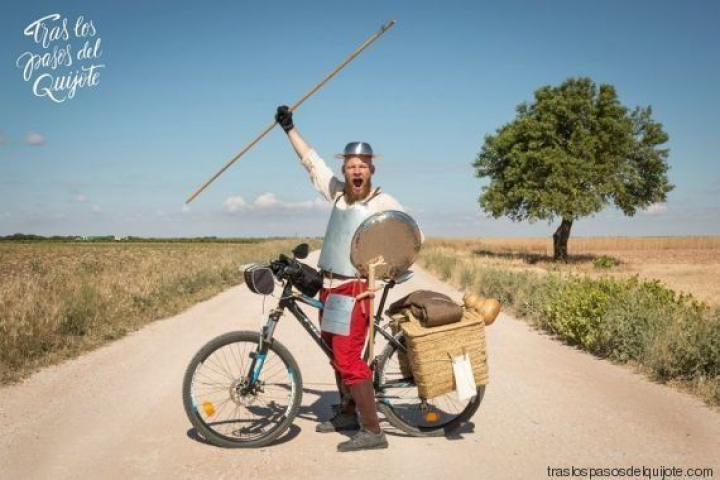 ¿Y por qué? ¿Cuál es el motivo de esta aventura? "Estaba hastiado del modo de vida que llevaba y del trabajo que tenía. Me había presentado a varias convocatorias de oposiciones a la policía y hacía unos meses que ejercía de agente de seguridad en un psiquiátrico y, aunque el sueldo me venía fenomenal, era un trabajo duro… Cuando cubría turnos de noche me dedicaba a releer El Quijote, mi libro preferido. Mientras lo leía, me acordaba de los lugares que había descubierto hace unos años, cuando hice por primera vez la ruta. Recordaba, especialmente, la sensación de paz y felicidad que tenía cuando estaba sentado ante los molinos de Campo de Criptana, leyendo ese capítulo del libro. Y ahí empezó todo. ¿Y si la hago otra vez? ¿Y si en vez de ir con mallas y casco, voy con yelmo, espada y armadura?".
