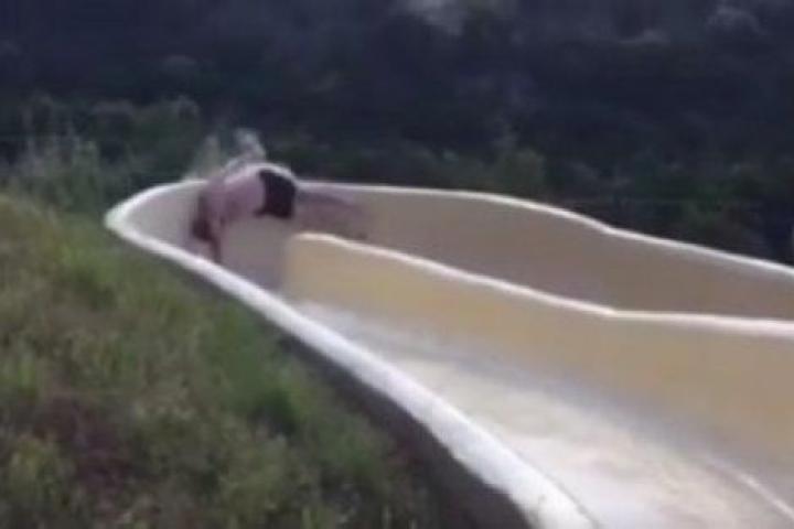 Un hombre sale volando de un tobogán acuático y cae por un acantilado