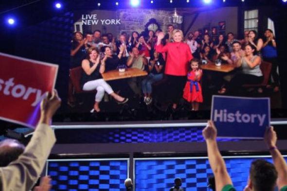 "Es un honor increíble que me hayáis elegido", ha asegurado la ex secretaria de Estado, desde una pantalla en la que se ha podido ver un enorme cristal rompiéndose en mil pedazos después de un pase de imágenes de varios expresidentes de Estados Unidos.