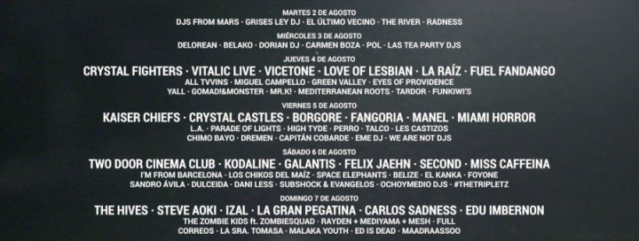 Por sus escenarios pasarán artistas internacionales como Crystal Fighters, Kaiser Chiefs, Two Doors Cinema Club o The Hives. Los asistentes podrán bailar desde las letras más reivindicativas de Los Chikos del Maíz hasta el techno de Steve Aoki.