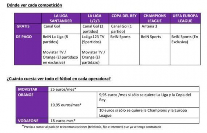 En cuanto a los partidos de pago, cada operadora (Movistar, Orange, Vodafone...) depende de los acuerdos firmados con plataformas como BeIN Sports, canal que este año ha vuelto a hacerse en exclusiva con los derechos de emisión de la Champions League y la UEFA Europa League. Este canal, que puede verse en Movistar, Orange, Vodafone y Telecable, también ha logrado este año los derechos para emitir ocho partidos por jornada de Primera.