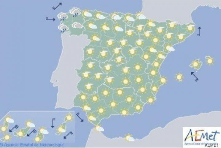 Se esperan intervalos nubosos a lo largo del día en otras zonas de la mitad norte peninsular y cielo despejado en el resto del país. Habrá nubes bajas al principio del día en el litoral de Cádiz y de Tarragona, Ceuta, Melilla y norte de Canarias.