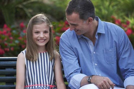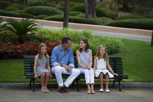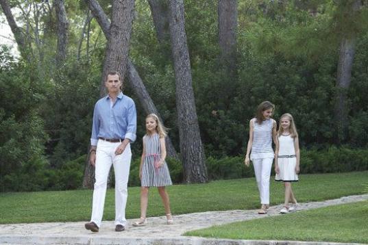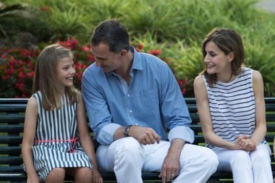 Con vestidos de seda -marfil ribeteado de azul marino el de Leonor y de rayas verticales azules y blancas el de Sofía-, las niñas han contribuido además a variar la composición del grupo para el reportaje gráfico cuando se han situado de pie tras sus padres, ambos con pantalones blancos y con tonos azules y blancos tanto en la camisa de don Felipe como en la blusa de doña Letizia.