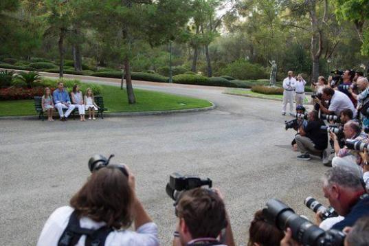 Allí, en el mismo lugar donde los informadores suelen esperar otros años al presidente del Gobierno cuando regresa de su despacho con el rey en Marivent, los cuatro han posado sentados en un tradicional banco de jardín, entre gestos de complicidad y cariño de los padres hacia sus hijas.