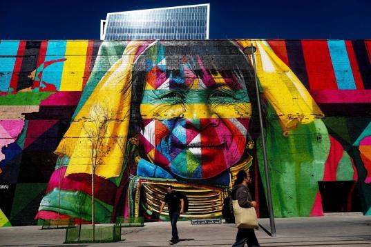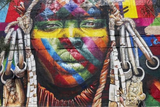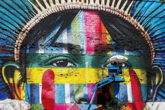 El mural se llama Etnias y representa el rostro de cinco personas, pertenecientes a cinco tribus indígenas de cada uno de los cinco continentes. El impresionante graffiti ocupa lo que era una zona deprimida en Rio de Janeiro, que con los Juegos se ha convertido en el Bulevar Olímpico.
