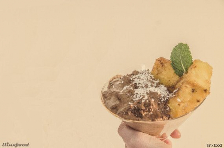 Por último, cortar una rodaja de piña sin bordes y colocarla en una sartén con un poco de mantequilla. Empezar con fuego muy fuerte y luego bajar para que la piña se vaya caramelizando. Cuando esté blanda, echar un chorro de ron. Subir el fuego, dejar un par de minutos y retirar. Colocar la mousse en una copa y al lado la piña en dados. Espolvorear ralladura de coco por encima.