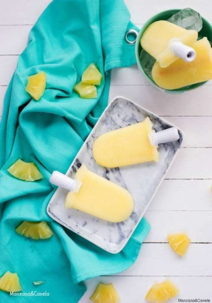 Escurrir las rodajas de piña y colocarlas en la túrmix con el ron y el sirope. Triturar hasta conseguir una textura muy fina. Verter en los moldes para polos y congelar durante mínimo cinco horas.