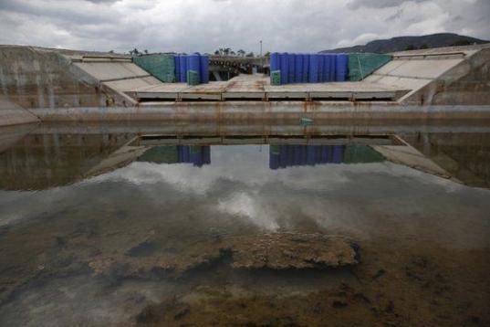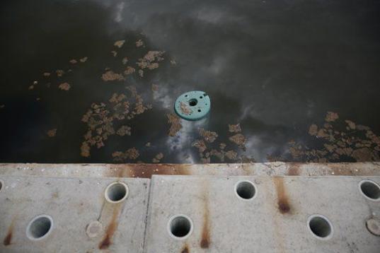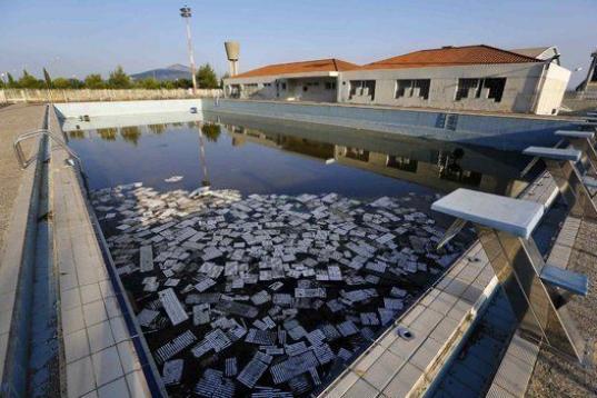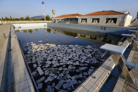 Una piscina utilizada en los Juegos de 2004 está repleta ahora de residuos flotantes.