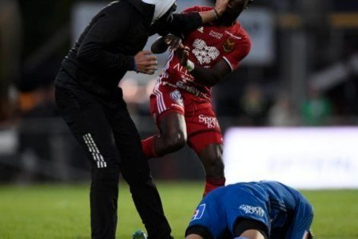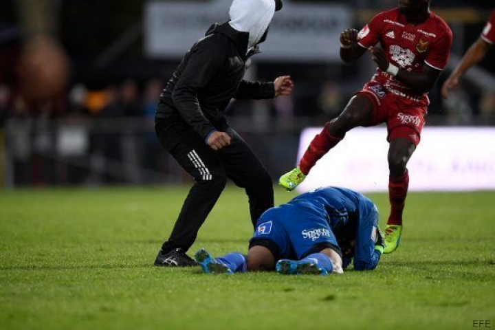 El aficionado persiguió corriendo por el césped a Keita hasta darle caza y golpearle en la cabeza, tirándolo al suelo, según se pudo ver en las imágenes desde el Stadsparksvallen de Jonköping (sur de Suecia) difundidas por medios suecos.