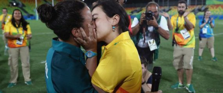 La voluntaria Marjorie Enya le pidió matrimonio a la jugadora brasileña IsadoraCerullo, tras la ceremonia de entrega de medallas de rugby a 7 la semana pasada.